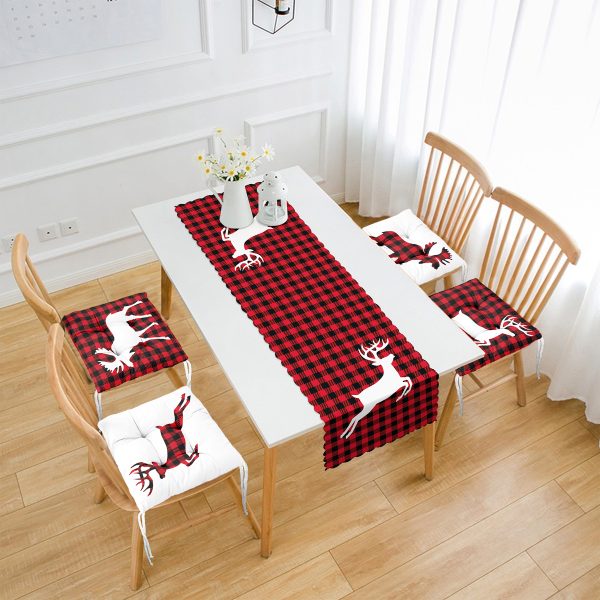 Kırmızı Ekoseli Geyik Tasarımlı 4 Pofuduk Sandalye Minderi ve 1 Runner Seti