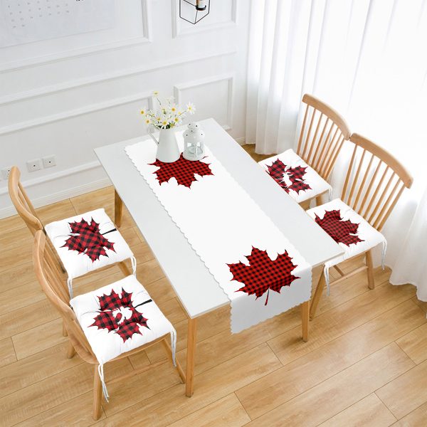 Beyaz Zemin Kırmızı Ekose Yaprak Tasarımlı 4 Pofuduk Sandalye Minderi ve 1 Runner Seti