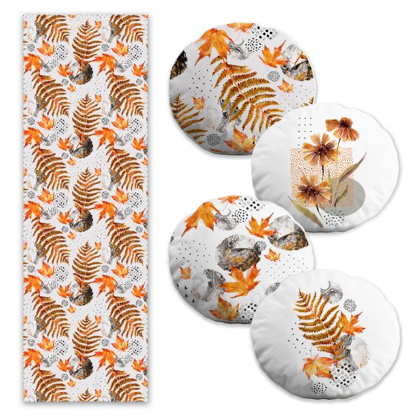 Sonbahar Temalı Yaprak Tasarımlı 4 Yuvarlak Kırlent 1 Runner Seti