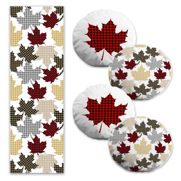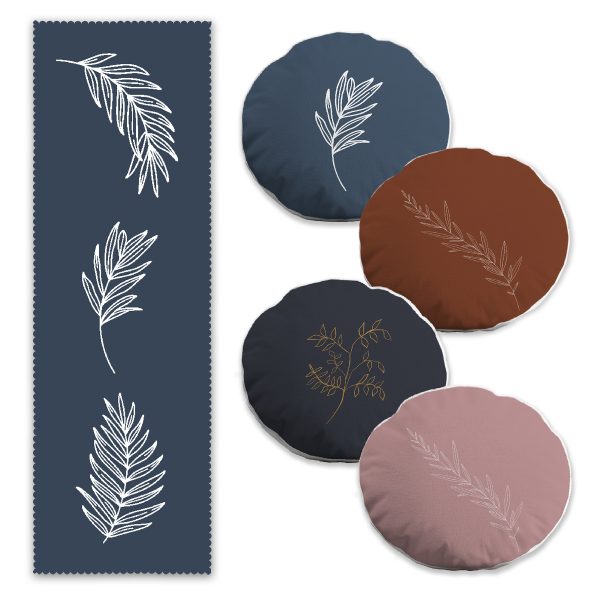 Ekose Yaprak Özel Tasarımlı 4 Yuvarlak Kırlent Kılıfı ve Runner Seti