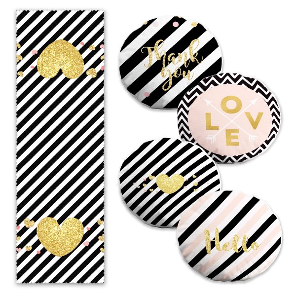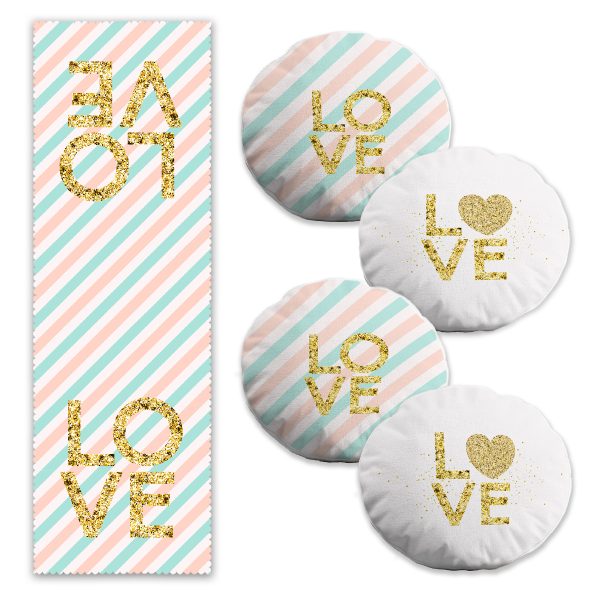 Aşk Temalı Gold Detaylı 4 Yuvarlak Kırlent Kılıfı ve Runner Seti