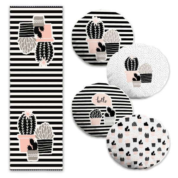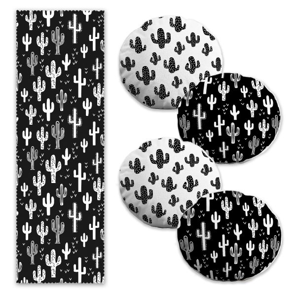 Siyah Beyaz Kaktüs Motifli 4 Yuvarlak Kırlent Kılıfı ve 1 Runner Seti