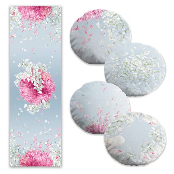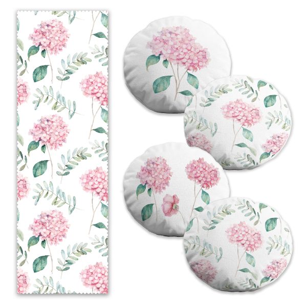 Beyaz Zemin Ortanca Çiçeği Motifli 4 Yuvarlak Kırlent Kılıfı ve 1 Runner Seti