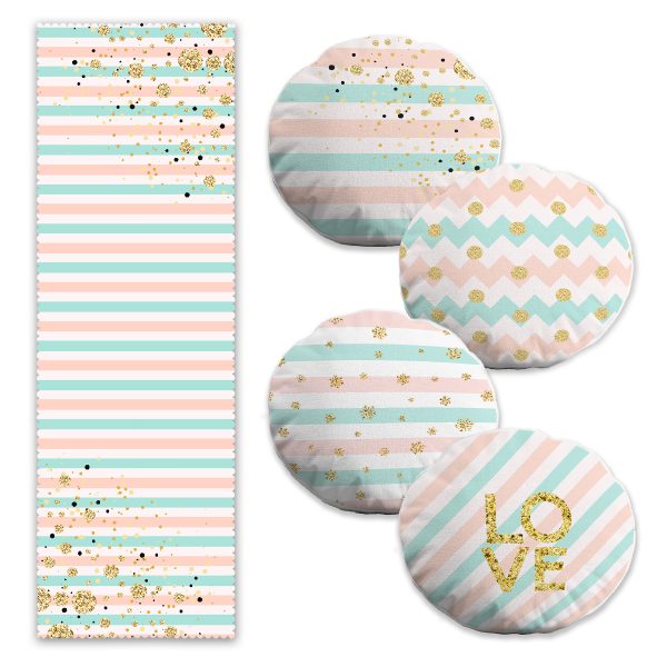 Pembe Çizgili Gold Detaylı Özel Tasarım 4 Yuvarlak Kırlent 1 Runner Seti