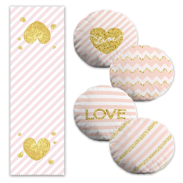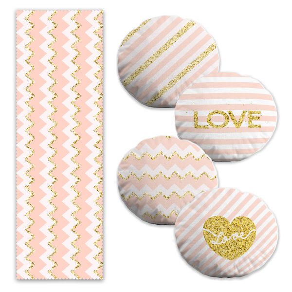 Pembe & Beyaz Altın Varaklı Love Temalı 4 Yuvarlak Kırlent Kılıfı ve 1 Runner Seti