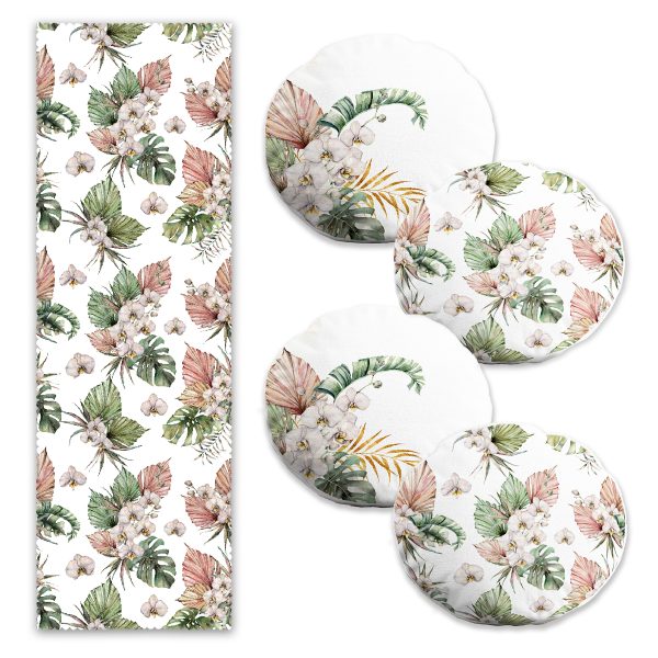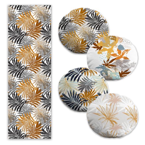 Kurumuş Tropik Yaprak Tasarımlı 4 Yuvarlak Kırlent Kılıfı ve Runner Seti