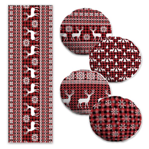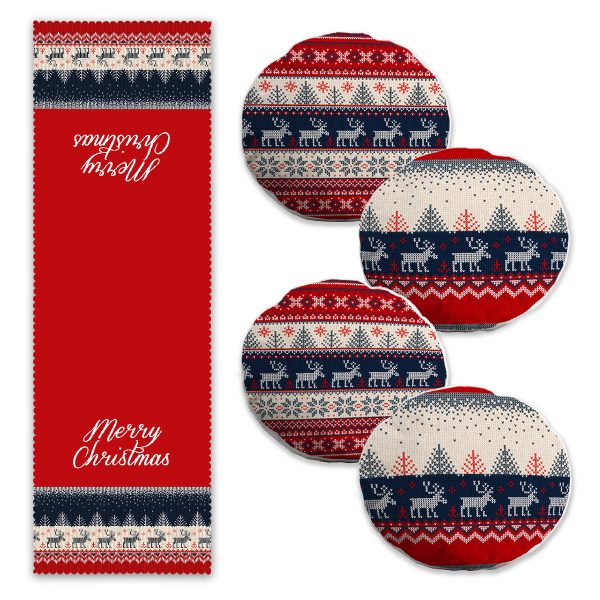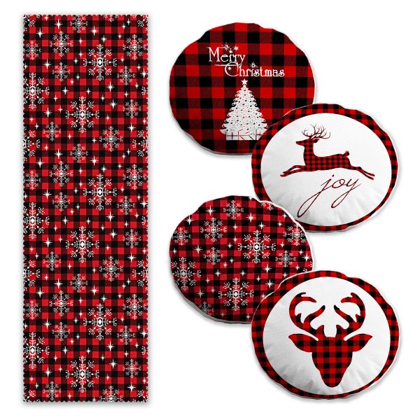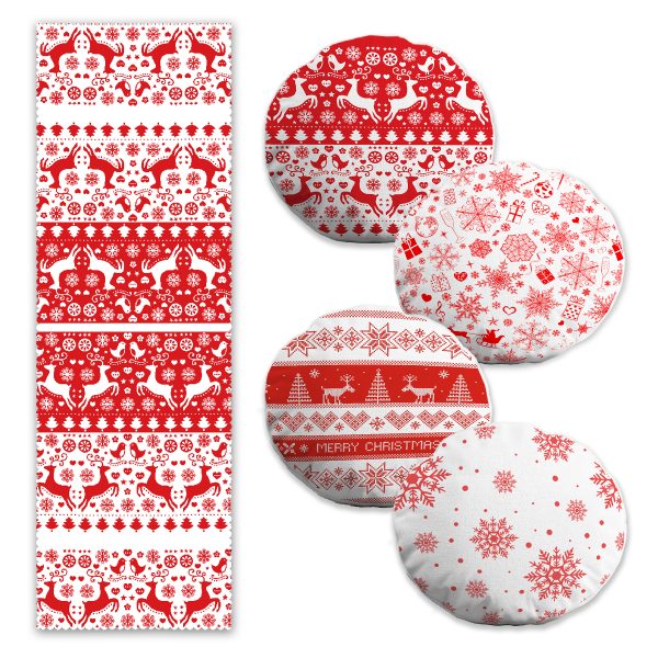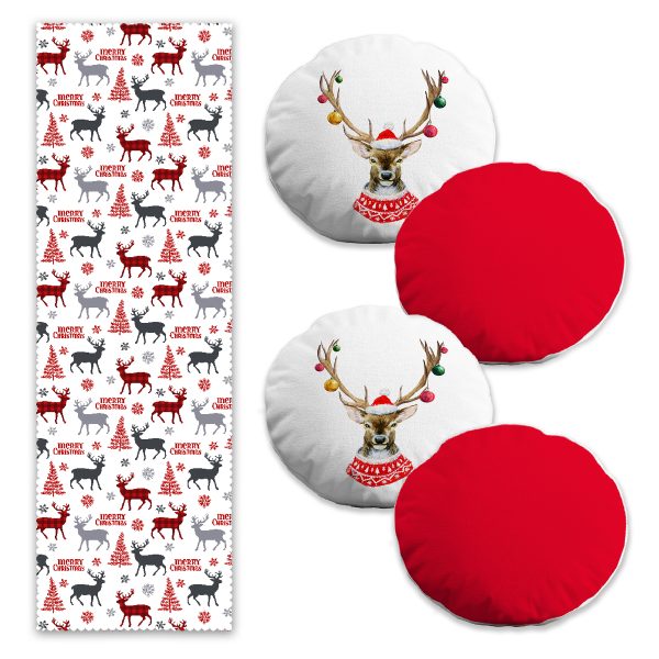 Kırmızı Beyaz Geyik Desenli Yılbaşı Motifli 4 Yuvarlak Kırlent Kılıfı ve 1 Runner Seti
