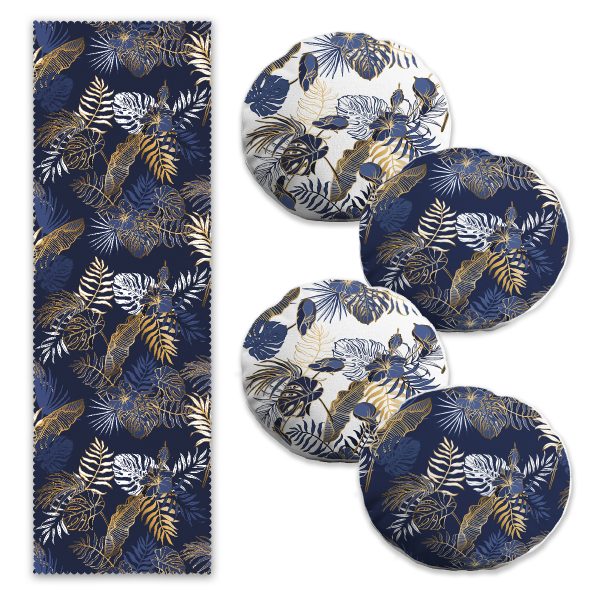 Lacivert Gold Detaylı Yaprak Tasarımlı 4 Yuvarlak Kırlent Kılıfı ve 1 Runner Seti