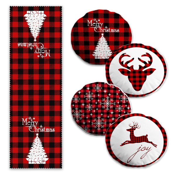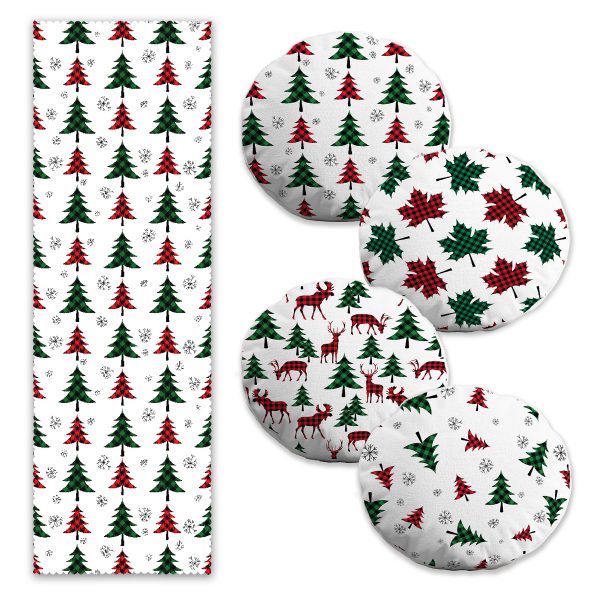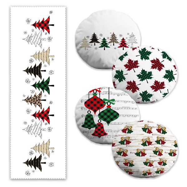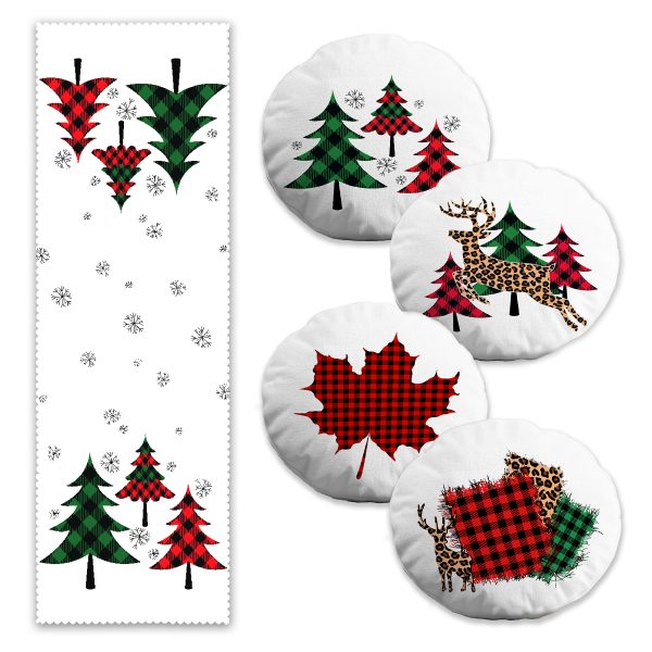 Yılbaşı Temalı Ekose Çam Ağaç Tasarımlı 4 Yuvarlak Kırlent Kılıfı ve Runner Seti