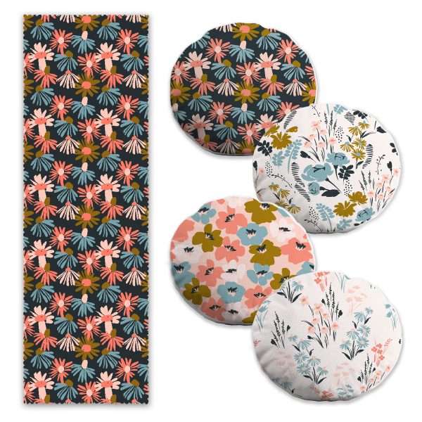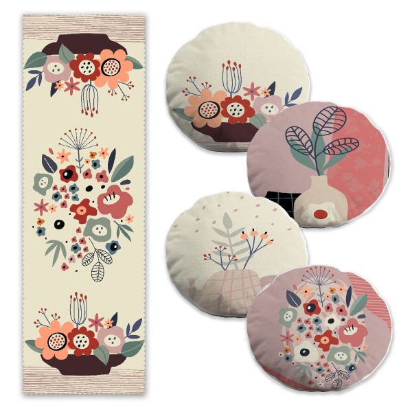 Rengarenk Çiçek Tasarımlı 4 Yuvarlak Kırlent Kılıfı ve 1 Runner Seti