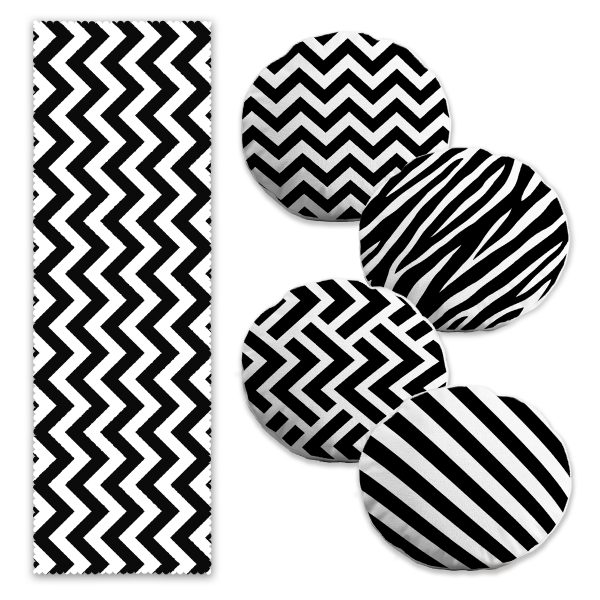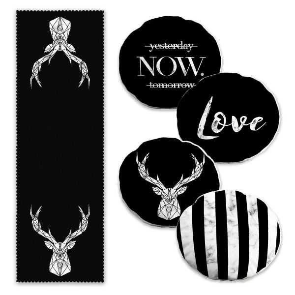 Siyah Beyaz Geometrik Tasarımlı 4 Yuvarlak Kırlent Kılıfı ve 1 Runner Seti