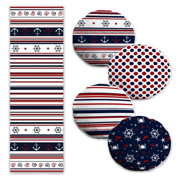 Bordo Lacivert Denizci Tasarım 4 Yuvarlak Kırlent Kılıfı ve 1 Runner Seti