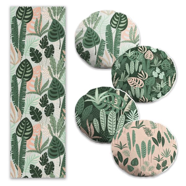 Yesil Tropik Yaprak Tasarımlı 4 Yuvarlak Kırlent Kılıfı ve Runner Seti