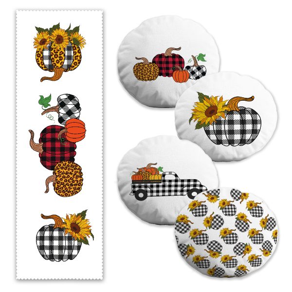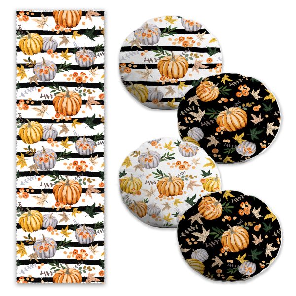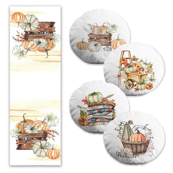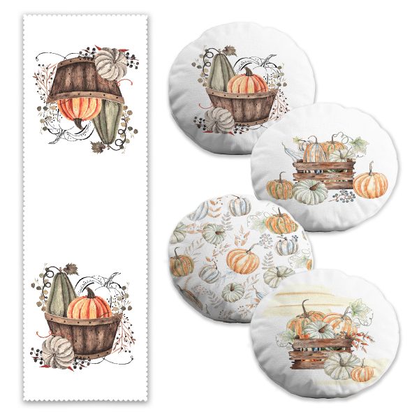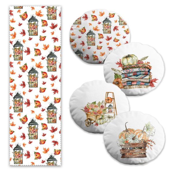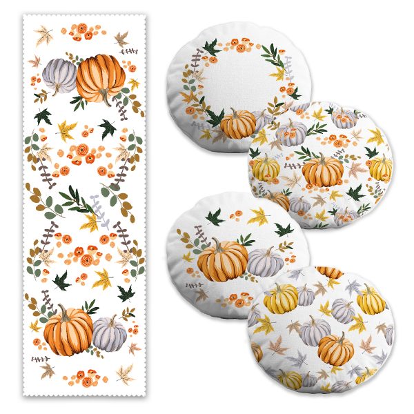 Sonbahar Temalı Kabak Motifli 4 Yuvarlak Kırlent Kılıfı ve Runner Seti