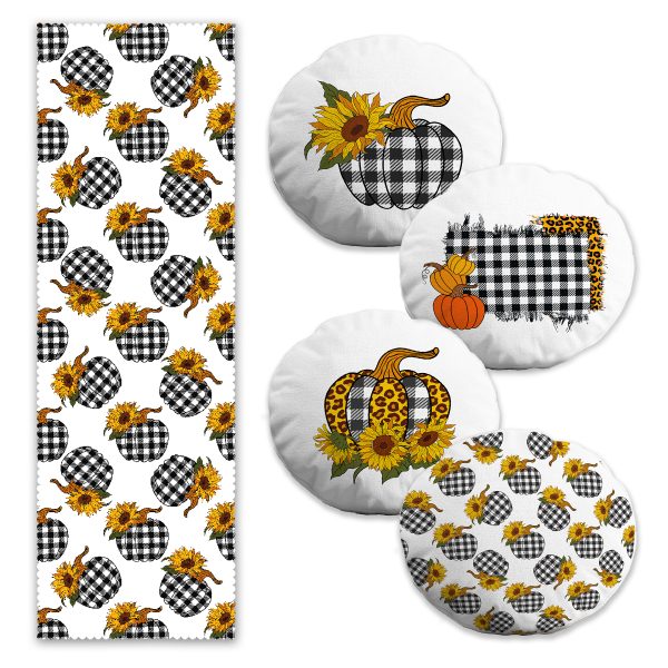 Siyah Ekose Kabak Ayçiçeği Motifli 4 Yuvarlak Kırlent Kılıfı ve Runner Seti