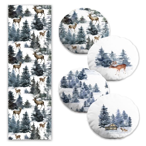 Geyik Desenli Yılbaşı Temalı 4 Yuvarlak Kırlent Kılıfı ve 1 Runner Seti