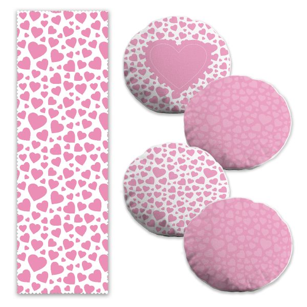 Özel Tasarım Pembe Kalpli Aşk Temalı 4 Yuvarlak Kırlent 1 Runner Seti