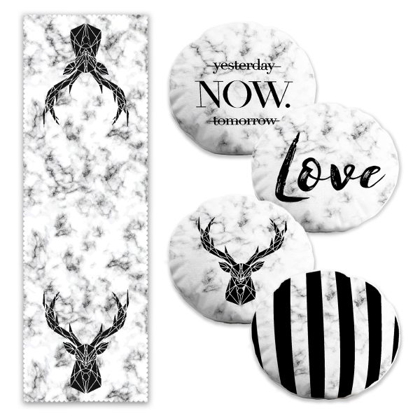 Mermer Zemin Siyah Özel Tasarımlı 4 Yuvarlak Kırlent 1 Runner Seti