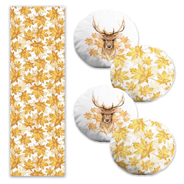 Gold Detaylı Yaprak & Geyik Tasarımlı 4 Yuvarlak Kırlent 1 Runner Seti