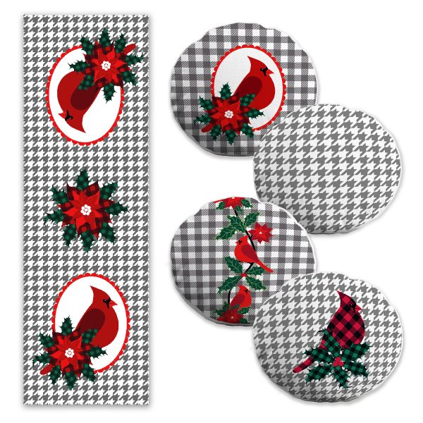 Gri Ekose Zeminli Kırmızı Kardiyal Kuşu Özel Tasarımlı 4 Yuvarlak Kırlent 1 Runner Seti