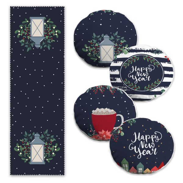 Lacivert Zeminli Happy New Year Tasarımlı Dijital Baskılı 4 Yuvarlak Kırlent 1 Runner Seti