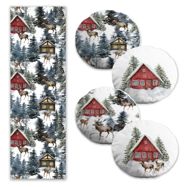 Kış Temalı Bağ Evi Konseptli Özel Tasarım 4 Yuvarlak Kırlent 1 Runner Seti