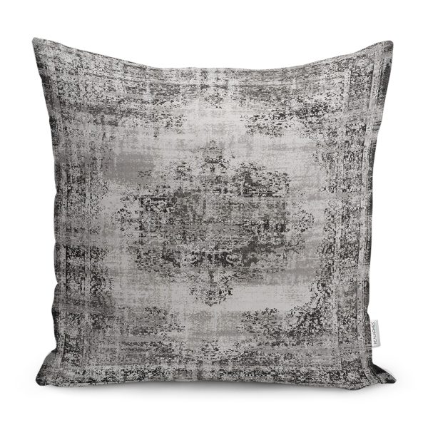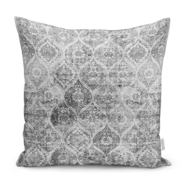 RealHomes Gri Zeminde Eskitme Motifli Kilim Desenli Dijital Baskılı Yastık Kırlent Kılıfı