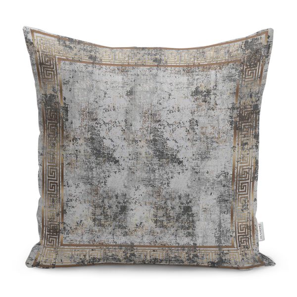 RealHomes Gri Zeminde Çerçeveli Motifli Eskitme Desenli Dijital Baskılı Yastık Kırlent Kılıfı