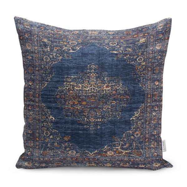 RealHomes Lacivert Zeminde Antik Motifli Dokuma Halı Desenli Dijital Baskılı Yastık Kırlent Kılıfı
