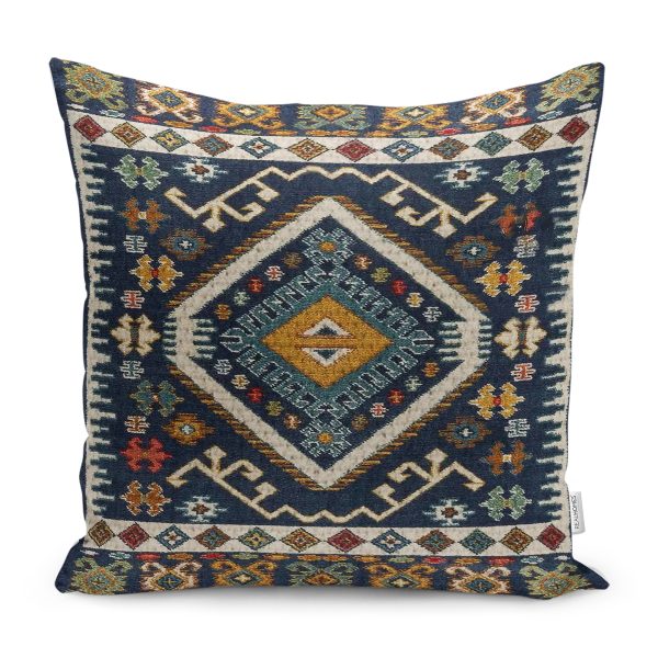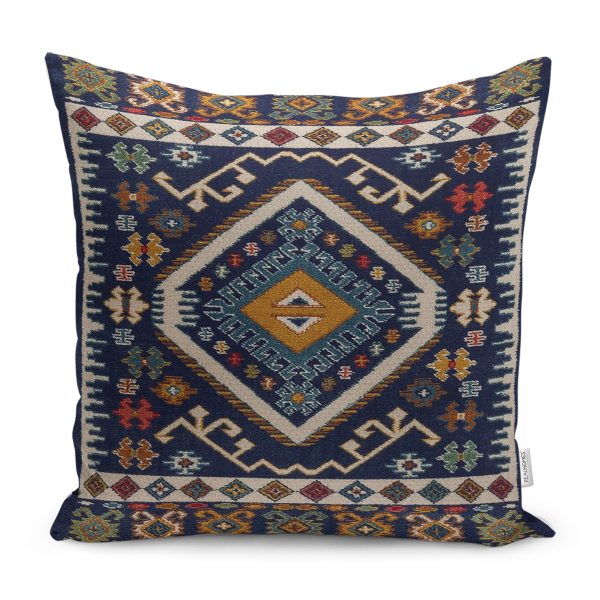 RealHomes Lacivert Zeminde Geleneksel Motifli Kilim Desenli Dijital Baskılı Yastık Kırlent Kılıfı