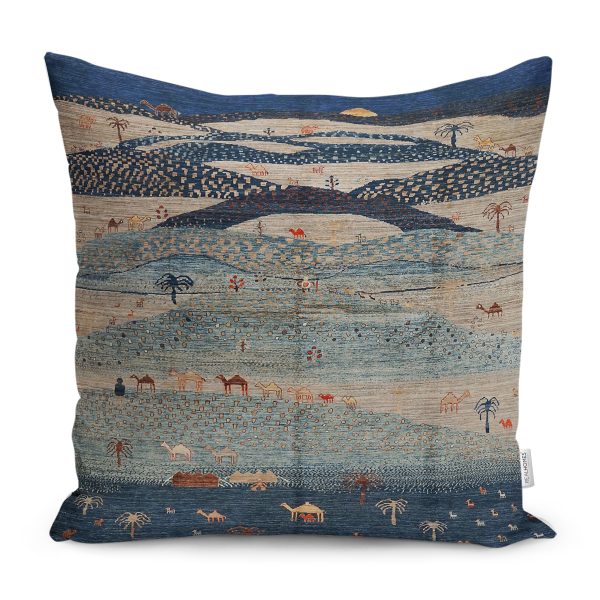 RealHomes Lacivert Zeminde Eskitme Motifli Kilim Desenli Dijital Baskılı Yastık Kırlent Kılıfı