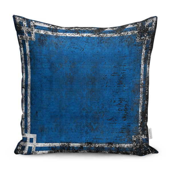 RealHomes Lacivert Zeminde Çerçeveli Motifli Eskitme Desenli Dijital Baskılı Yastık Kırlent Kılıfı