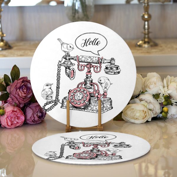 Beyaz Zemin Antika Telefon Çizimli Dijital Baskılı Dekoratif 2’li Yuvarlak Servis Altlığı – Supla