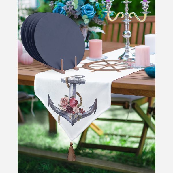 Beyaz Zeminde Sade Çapa Tasarımlı Dijital Baskılı Dekoratif Üçgen Püsküllü Runner 1 Adet & 6 Adet Lacivert Renkli Supla