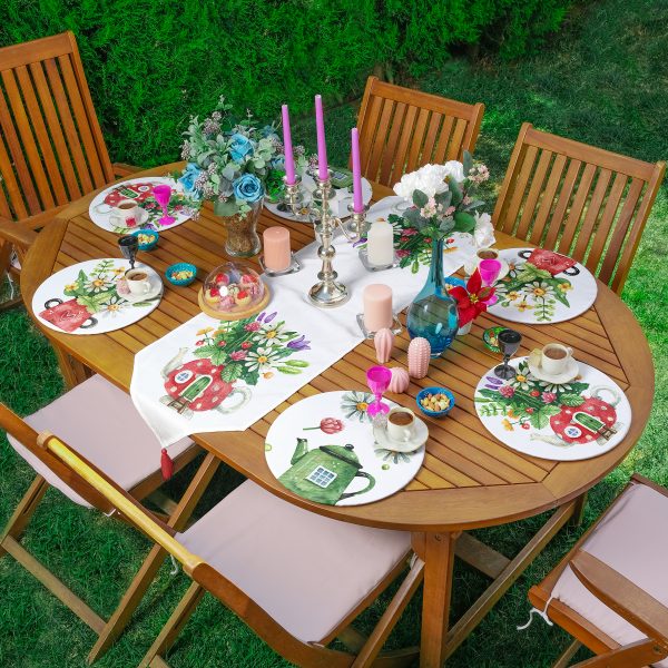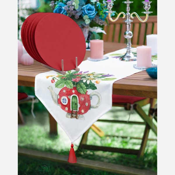 Şirin Çaydanlık Vazo Tasarımlı Dijital Baskılı Modern Üçgen Püsküllü Runner 1 Adet & 6 Adet Kırmızı Renkli Supla