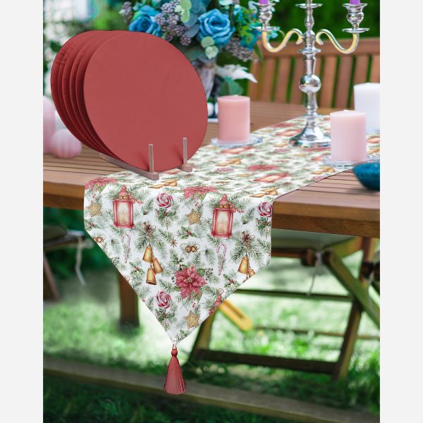 Şamdan Tasarımlı Yılbaşı Konseptli Dijital Baskılı Dekoratif Üçgen Püsküllü Runner 1 Adet & 6 Adet Bordo Renkli Supla