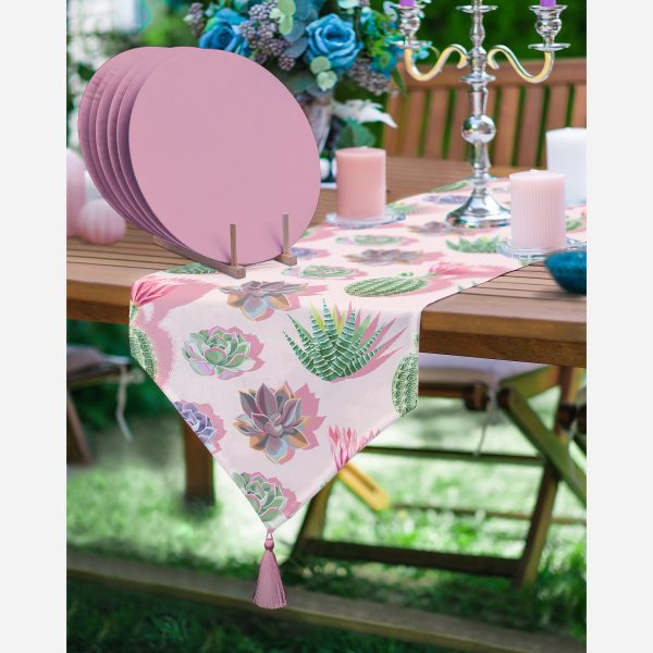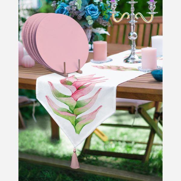 Egzotik Yaprak Tasarımlı Dijital Baskılı Dekoratif Üçgen Püsküllü Runner 1 Adet & 6 Adet Pembe Renkli Supla