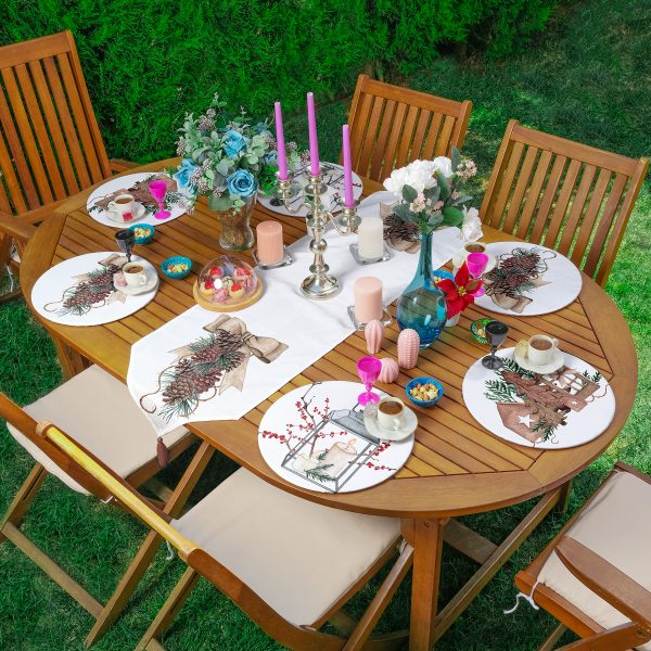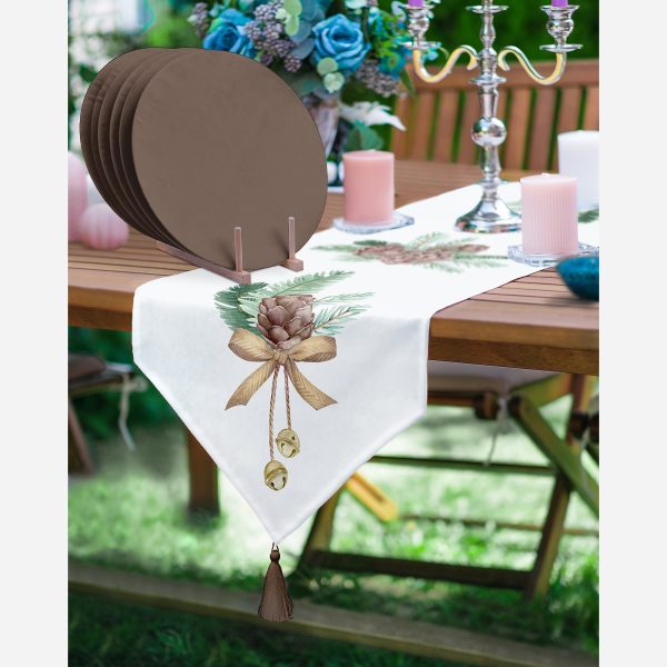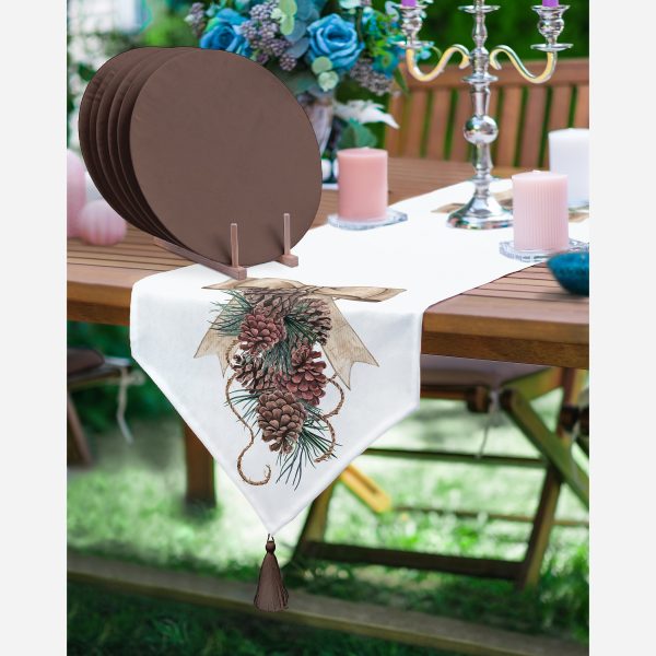Kozalak Çizimli Cristmas Temalı Dijital Baskılı Dekoratif Üçgen Püsküllü Runner 1 Adet & 6 Adet Kahverengi Renkli Supla