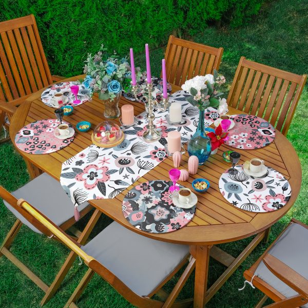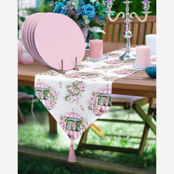 Çiçek Demetleri Özel Tasarım Dijital Baskılı Dekoratif Üçgen Püsküllü Runner 1 Adet & 6 Adet Pembe Rengarenk Supla