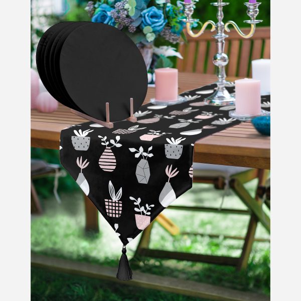Siyah Zemin Vazo Desenli Dijital Baskılı Modern Üçgen Püsküllü Runner 1 Adet & 6 Adet Siyah Renkli Supla