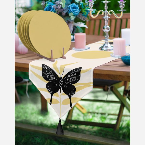 Hardal Zemin Siyah Kelebek Motifli Üçgen Püsküllü Runner 1 Adet & 6 Adet Hardal Renkli Supla