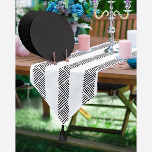 Siyah Beyaz İskandinav Çizgi Motifli Dekorati Üçgen Püsküllü Runner 1 Adet & 6 Adet Siyah Renkli Supla