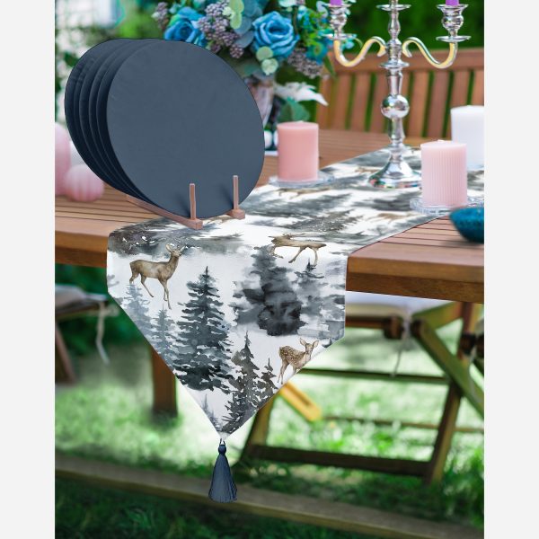 Suluboya Çam Ağacı & Geyik Tasarımlı Dijital Baskılı Modern Üçgen Püsküllü Runner 1 Adet & 6 Adet Lacivert Renkli Supla