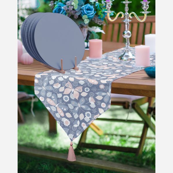 Renkli Kelebek Motifli Dijital Baskılı Dekoratif Üçgen Püsküllü Runner 1 Adet & 6 Adet Mavi Renkli Supla