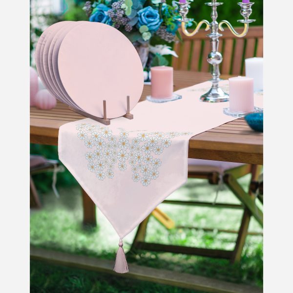 Pembe Zemin Kelebek Papatya Tasarımlı Üçgen Püsküllü Runner 1 Adet & 6 Adet Pembe Renkli Supla