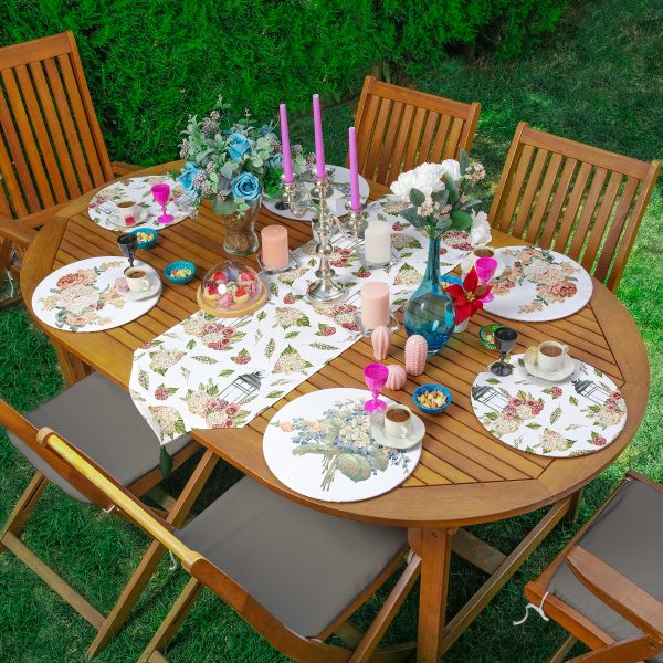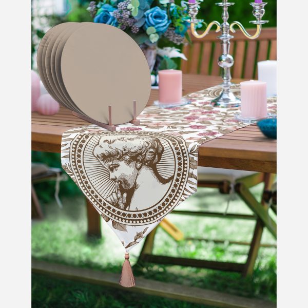 Rengarenk Çiçek Portre Motifli Dijital Baskılı Dekoratif Üçgen Püsküllü Runner 1 Adet & 6 Adet Vizon Rengarenk Supla