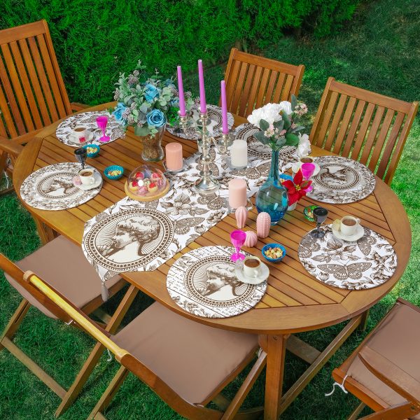 Kurdaleli Kozalak Motifli Dijital Baskılı Dekoratif Üçgen Püsküllü Runner 1 Adet & 6 Adet Kahverengi Renkli Supla