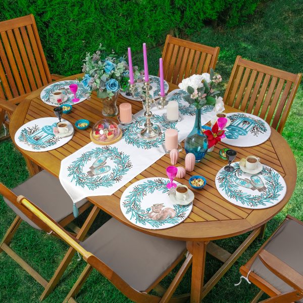 Yılbaşı Kar Temalı Çelenk Desenli Üçgen Püsküllü Runner 1 Adet & 6 Adet Açık Mavi Renkli Supla