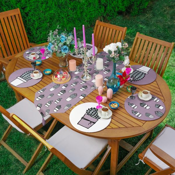 Eflatun Zeminli Kaktüs Motifli Dijital Baskılı 6+1 Supla Runner Seti