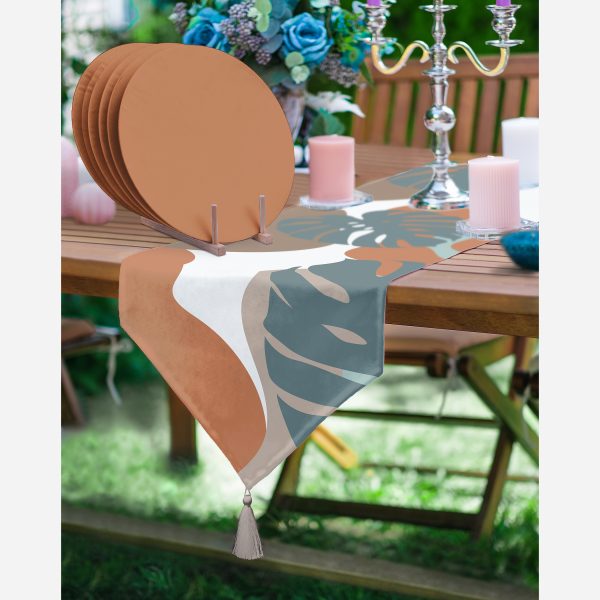 Renkli Zemin Tropik Yaprak Çizimli Dijital Baskılı Dekoratif Üçgen Püsküllü Runner 1 Adet & 6 Adet Kahverengi Renkli Supla